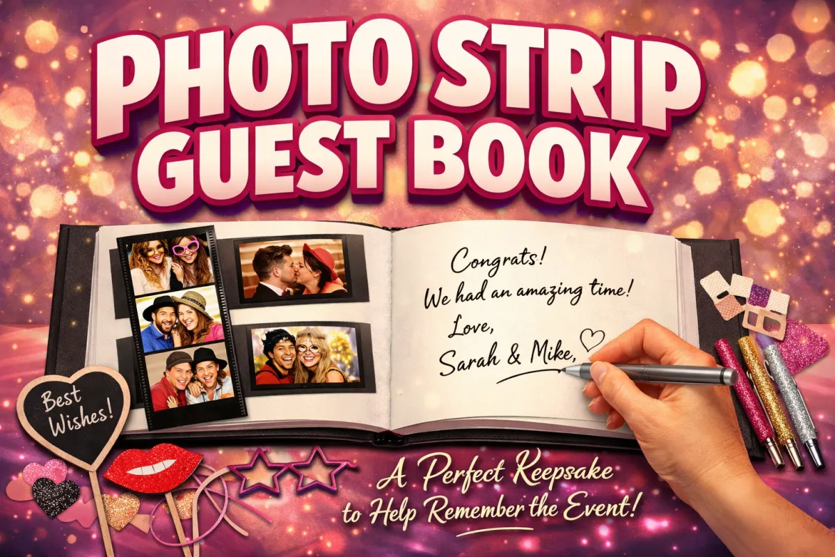Add one of our Photo Strip Guest Books to your package. This book includes slots for your guests to insert copies of their pics and a place to leave a message. A perfect keepsake to help remember the event!