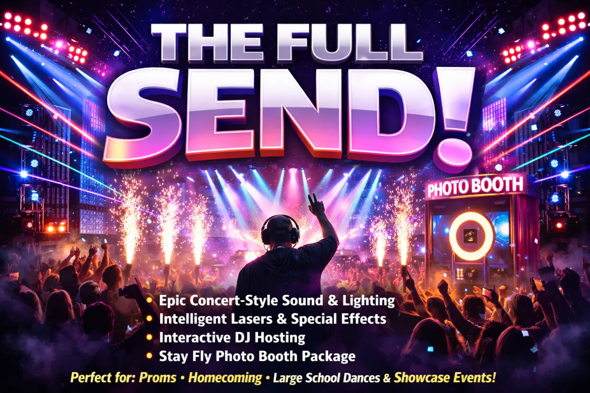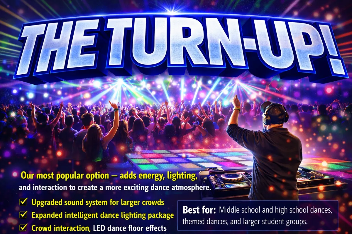 A full production feel that turns your school dance into a major event. Designed for proms, large dances, and high-energy celebrations.